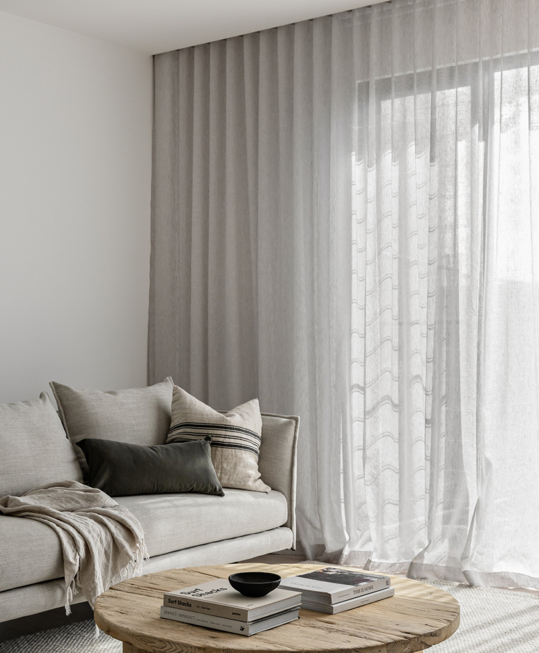 Three Gables Sheer linen curtains soften this exquisite monochromatic home